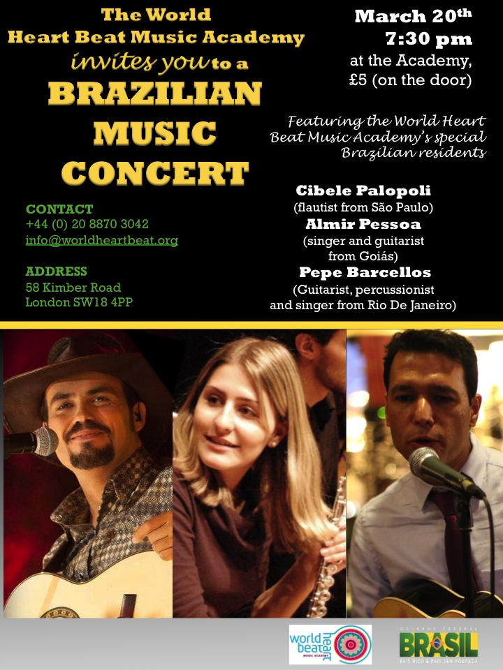 We would like to warmly invite you to what is going to be an amazing Brazilian music concert at the World Heart Beat Music Academy on Friday 20th of March at 7:30pm. This will feature our Brazilian residents musicians Almir Pessoa, Cibele Palopoli, and Pepe Barcellos. The World Heart Music Beat Academy has formed a unique partnership with the Ministry of Culture in Brazil, linking the two nations in the time leading up to the 2016 Olympic Games in Rio.