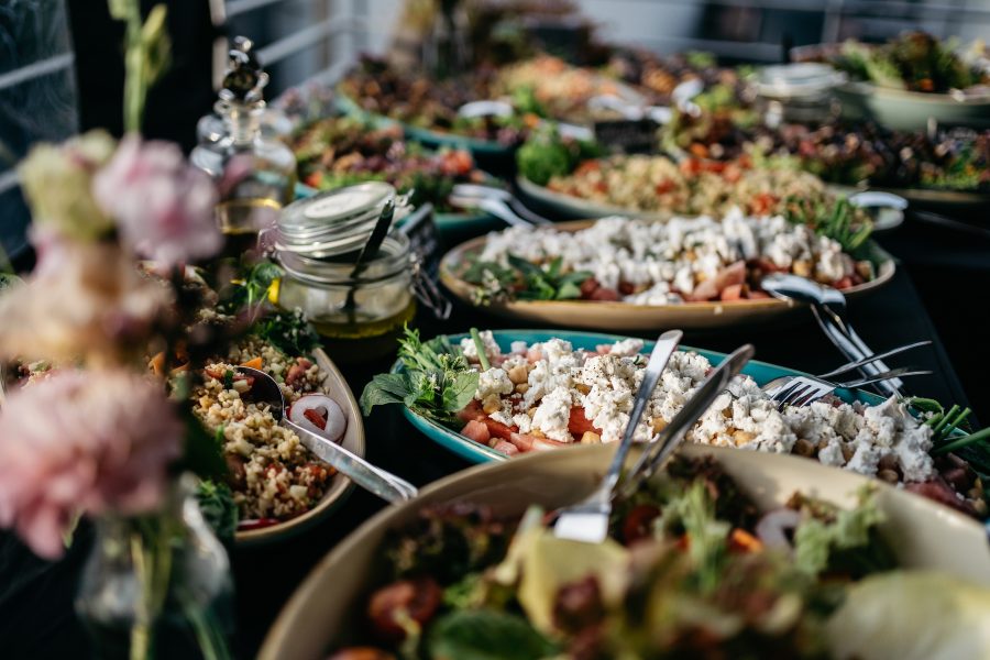 Image caption: A beautifully arranged buffet spread featuring various Mediterranean-style salads and dishes. The composition shows colorful bowls filled with fresh salads topped with crumbled feta cheese, quinoa preparations, and mixed greens. Glass jars with dressings or oils are visible, and serving utensils are placed throughout. The shallow depth of field creates an appetizing focus on the food, while soft pink flowers add an elegant decorative touch in the foreground. The presentation suggests a high-end catering event or upscale restaurant setting.