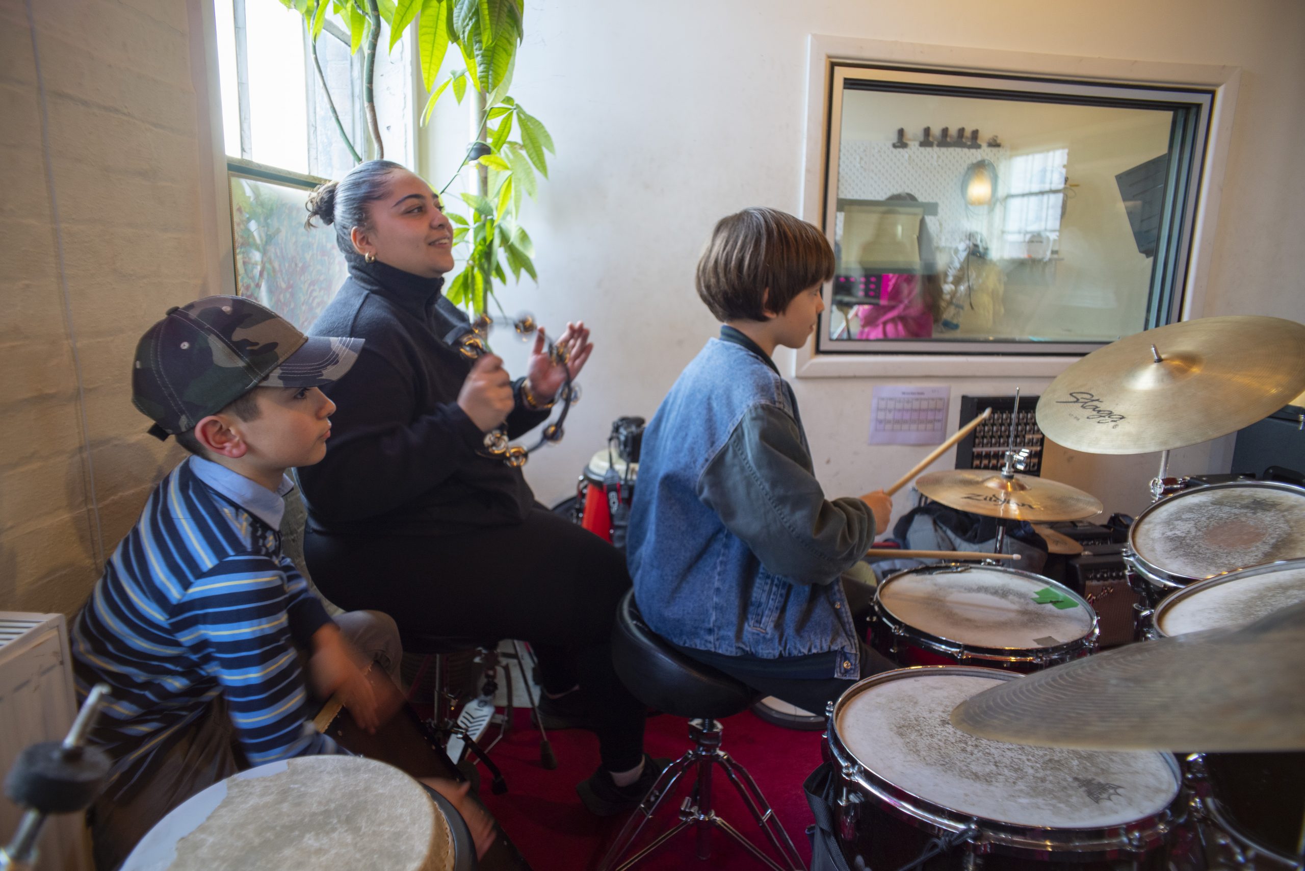 Image caption: World Heart Beat Music Academy in south west London, is a space where young people, aged 5-25, are brought together with world class musicians to share their love of music. Kimber Road, London 21st February 2023